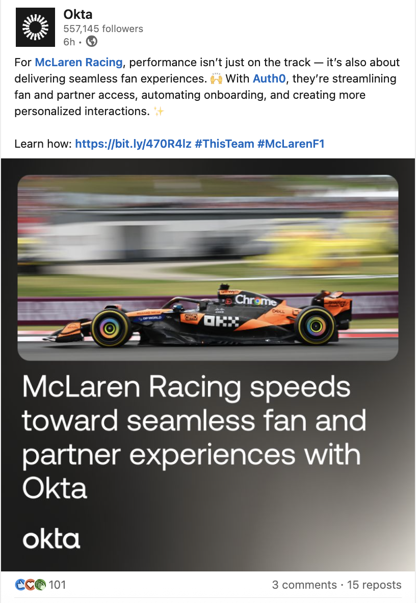 Played a key role in developing and executing Okta's social media strategy for the McLaren Formula 1 partnership. Key contributions included: